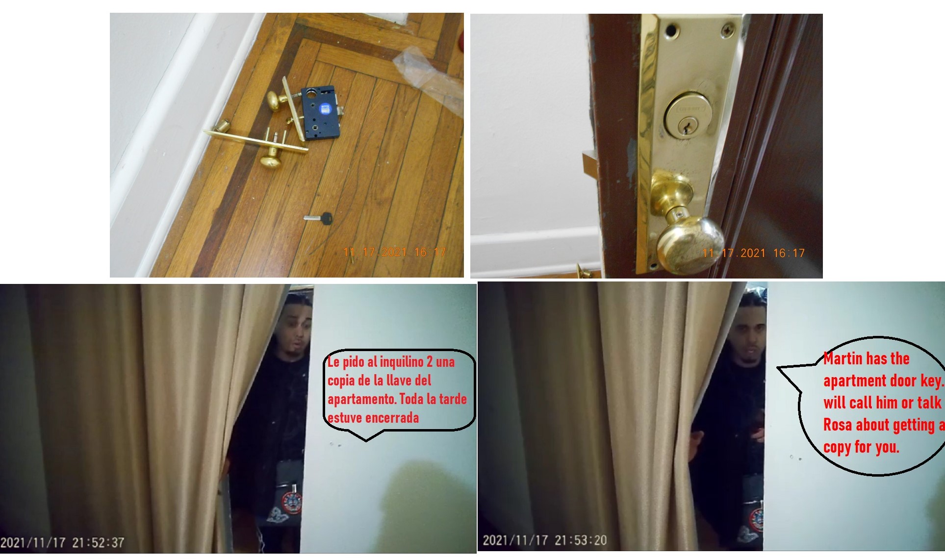 El 15 de septiembre de 2021, dos oficiales de la policía de Nueva York llegaron a mi habitación y fueron informados de la situación que la Sra. Catano me había sometido. El 17 de septiembre de 2021, un hombre alquiló la sala de estar rodeada por cortinas. En la noche lo escuché quejarse y gritar en voz alta y yo fui a ayudarlo. Su madre estaba con él, y me dijo que su hijo tenía un ataque de ansiedad. Estaba en el piso, le ofrecí llevarlo a un hospital, pero se negó a ir. Una hora más tarde me sorprendió cuando apareció en la cocina para asustarme y hacer muecas como solía hacerlo el primo de la casera. La Sra. Catano estaba en el pasillo oscuro esperando mi reacción. El 17 de noviembre de 2021, alrededor del mediodía, rompió la llave de la puerta del apartamento. Traté de ayudarlo, pero no tuvo éxito, el súper vino y puso una cerradura nueva. Por la noche le pedí una copia de la llave, y me dijo que Martín, el encargado de alquilar habitaciones, las distribuirá. Al día siguiente tuve que llamar a la policía para obtener una copia de la llave.